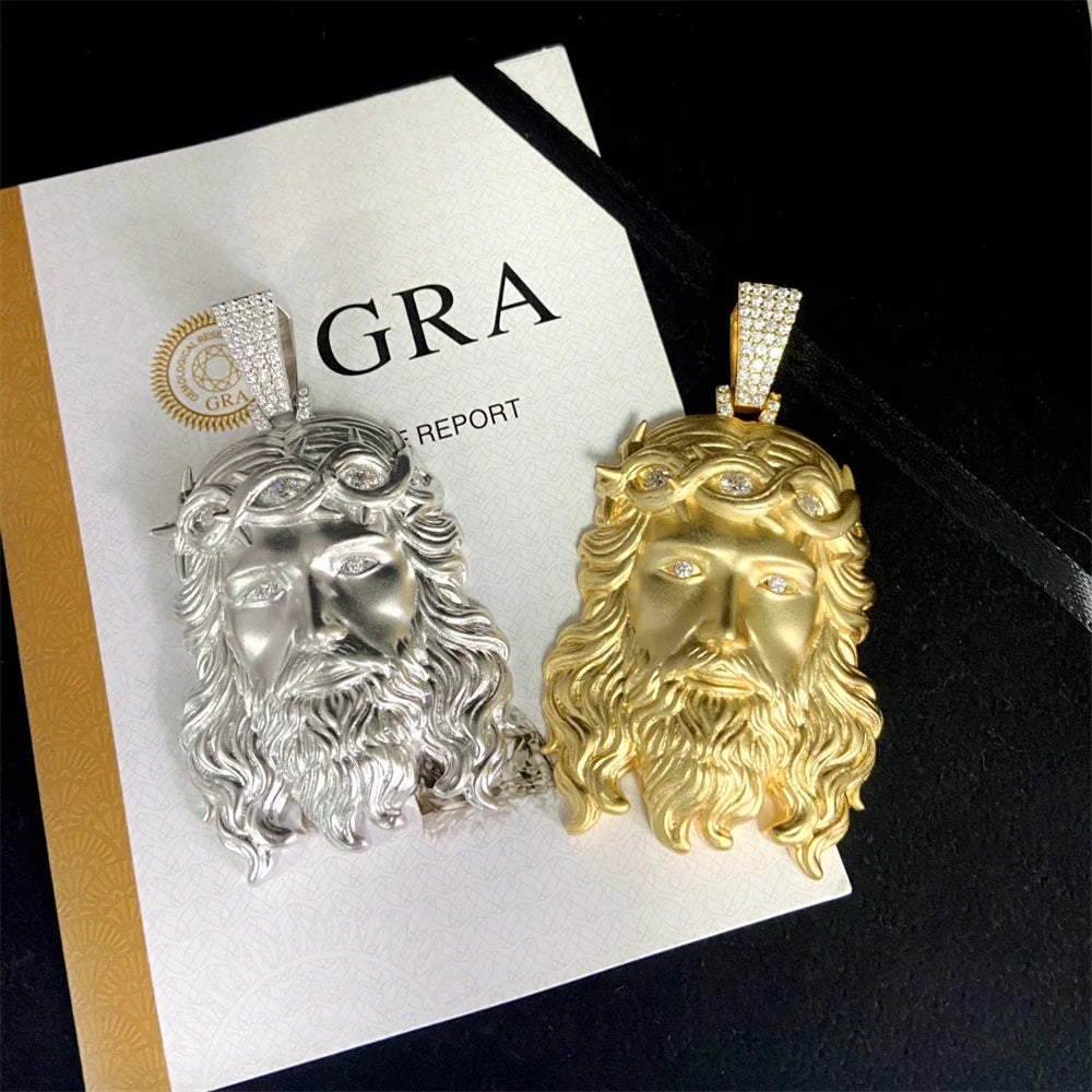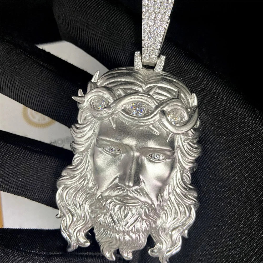 Make a bold statement of faith and style with this handcrafted Jesus pendant, expertly made from genuine 925 sterling silver and fully iced with VVS Moissanite stones that pass the diamond tester. The sandblast finish adds a refined texture that enhances its radiant brilliance. Designed for both men and women, this pendant includes GRA certification and delivers a perfect mix of luxury, craftsmanship, and spiritual expression.