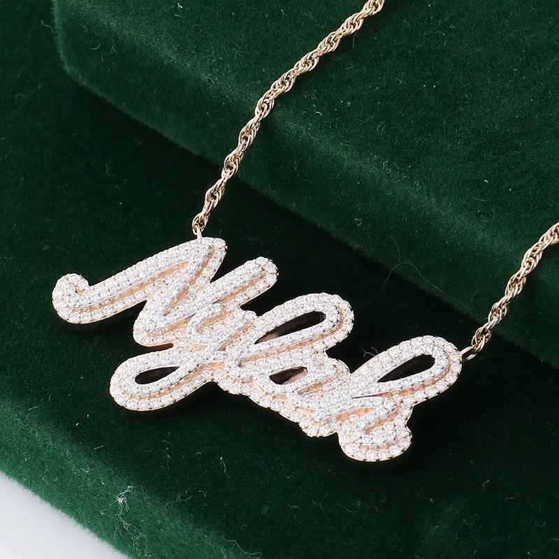Showcase your individuality with this elegant custom name pendant necklace, handcrafted from solid 10K or 14K gold and set with radiant VVS Moissanite stones that pass the diamond tester. The refined twist chain design adds a touch of modern sophistication, creating a timeless statement piece perfect for gifting or everyday wear. A symbol of craftsmanship, brilliance, and personal expression.