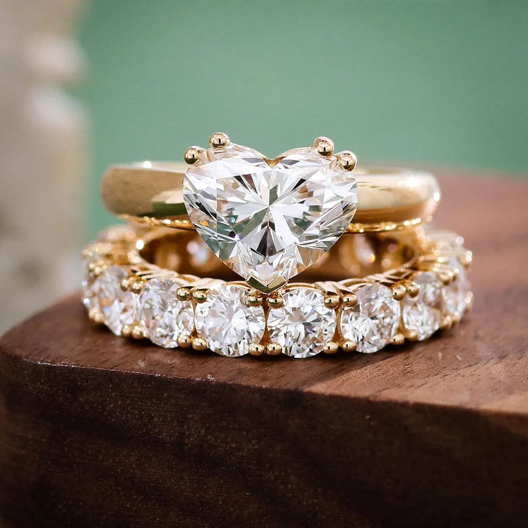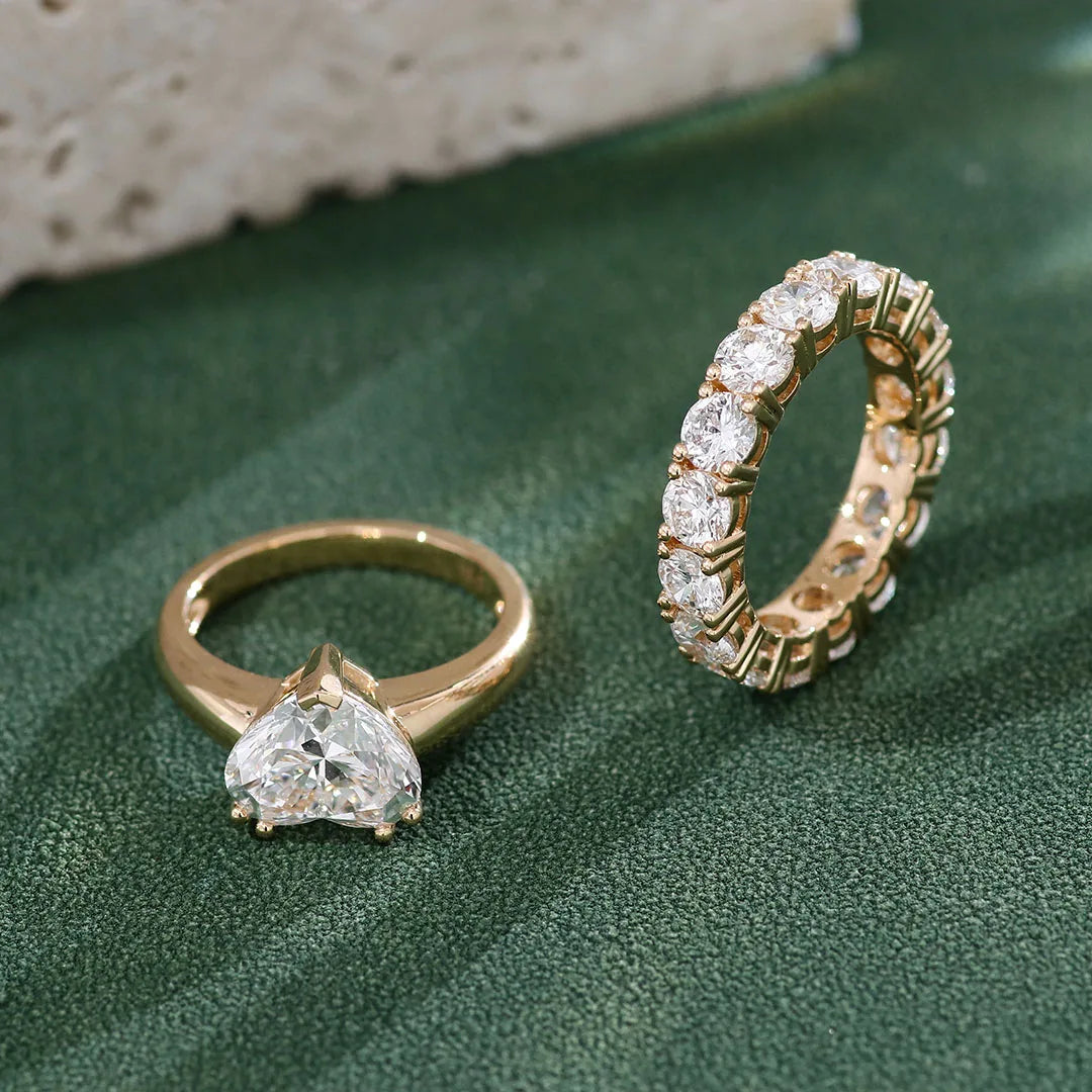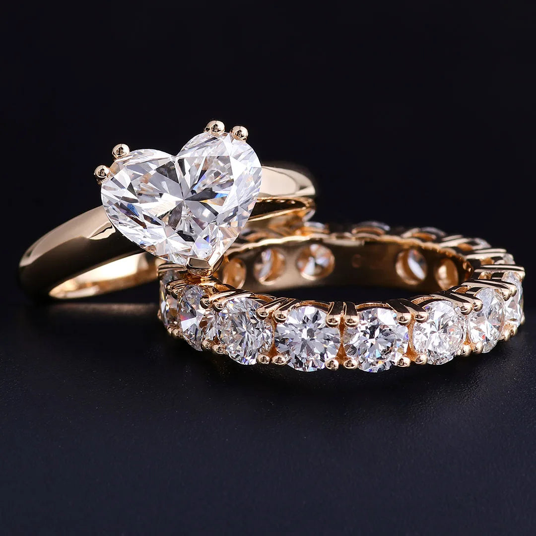 Celebrate everlasting love with this elegant 18K solid gold bridal ring set, featuring a 2-carat heart-cut VVS Moissanite centerpiece paired with a matching eternity band. Each stone is hand-set for maximum brilliance, symbolizing romance, devotion, and timeless beauty. Perfect for engagements, weddings, or anniversaries, this luxurious set embodies the finest craftsmanship and sparkle that lasts a lifetime.