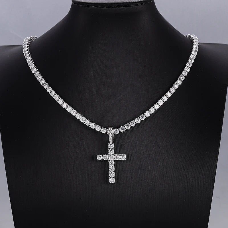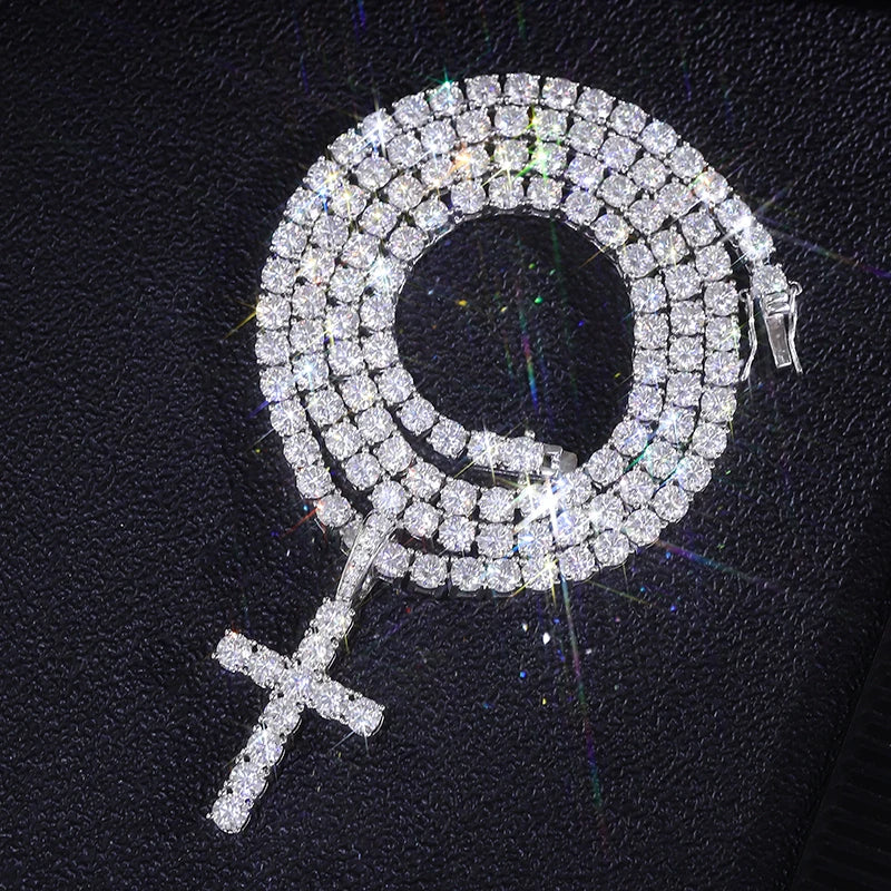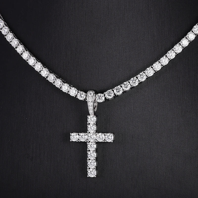 12mm Moissanite Cross Chain in 925 Silver with Round Cut Stones