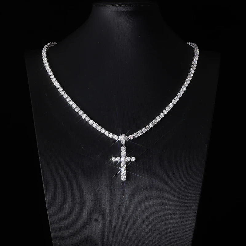 Gracefully designed for timeless elegance, this Provence cross necklace features dazzling D Color VVS1 Moissanite stones, each expertly hand-set in a 925 sterling silver link tennis chain. The radiant 4mm stones offer unmatched brilliance, while the sleek cross pendant embodies purity and sophistication. Certified by GRA, this necklace makes a meaningful and luxurious gift for women who appreciate fine craftsmanship and refined beauty.
